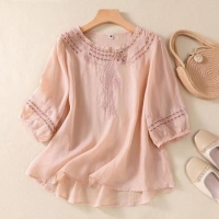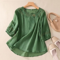 時尚減齡又好看的棉麻五分袖襯衫 輕盈透氣遮肉顯瘦 復古刺繡精緻又洋氣 穿上身端莊優雅顯年輕